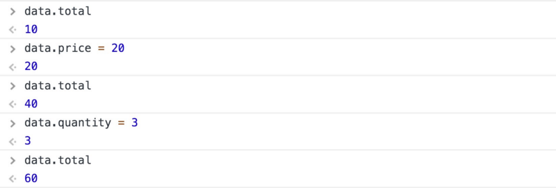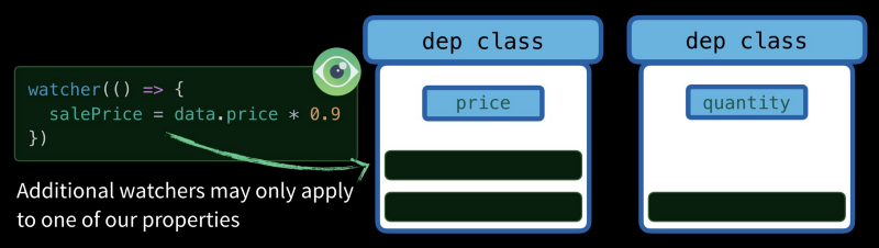 由于访问了data.price值,我希望price属性的Dep类将我们的匿名函数(存储在目标中)推送到其订阅者数组(通过调用dep.depend())。由于访问了data.quantity,我还希望quantity属性Dep类将此匿名函数(存储在目标中)推送到其订阅者数组中。