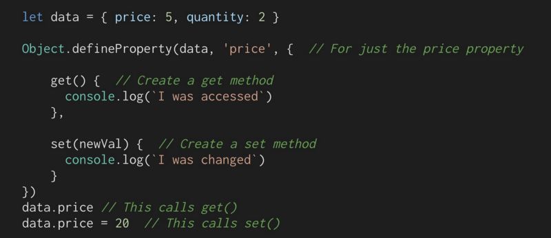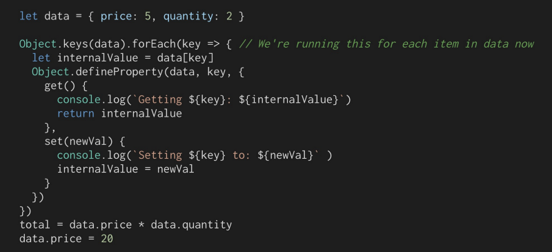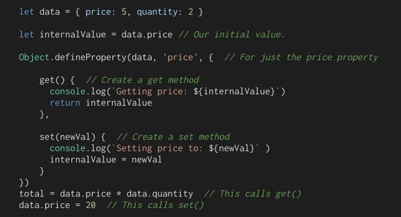 我们需要一些方法来挂钩数据属性(如价格或数量),所以当它被访问时我们可以将目标保存到我们的订阅者数组中,当它被更改时,运行存储在我们的订阅者数组中的函数。