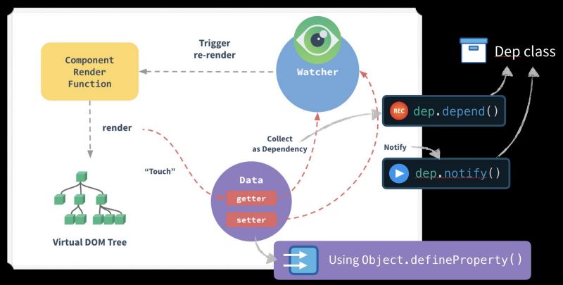 你看到那个漂亮的紫色数据圈了吗?看起来应该很眼熟!每个组件实例都有一个从getter(红线)收集依赖项的服务观察器实例(蓝色)。当稍后调用设置程序时,它会通知监视程序,它将导致组件重新呈现。下面是我自己的一些注释的图片。