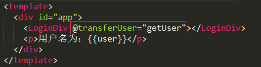 在父组件 App.vue 中,声明了一个方法 getUser,用 transferUser 事件调用 getUser 方法,获取到从子组件传递过来的参数 username