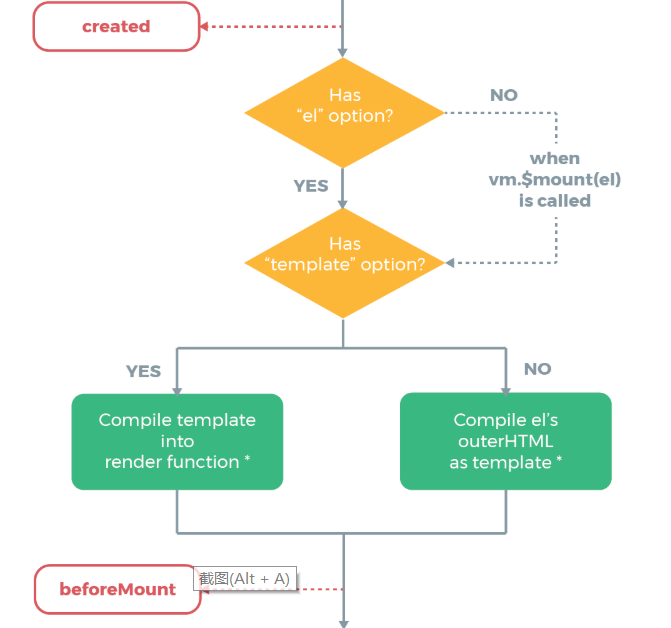 在这个过程中,$el被初始化为实例中el选项所对应的DOM元素,所以在beforeMount时,用vm.$el获取到的是挂载DOM元素的html。