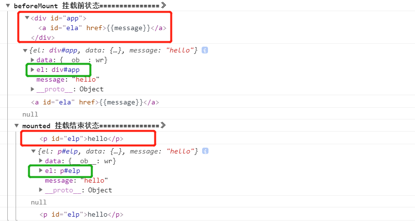 挂载前是以初始的el和虚拟DOM的形式存在的,此时以template中的内容为模板,模板内容不可见,打印p标签为null;
