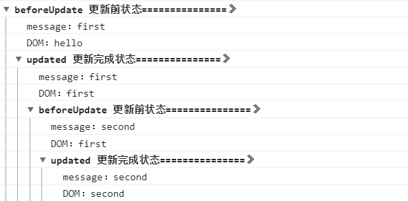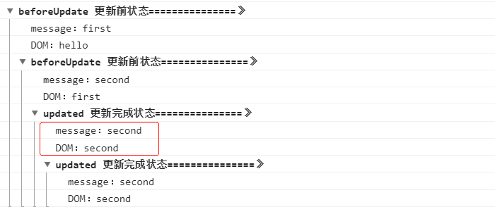 这里我们可以清楚的看到进行了两次更新流程,但是对打印的结果有些疑问:第一次将message的值改为first,并且以first来渲染更新DOM,那么第一次调用updated时,message和DOM中的值都应该是first,而此时打印出来的时second。我理解的是,在第一次执行updated时,DOM就已经完成了第二次渲染更新,具体的过程还需要通过之后对源码的学习去理解。这里各位有不同的理解或者更详细的解释,可以在评论区留言,共同学习。