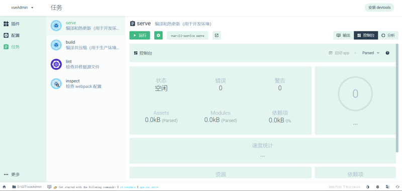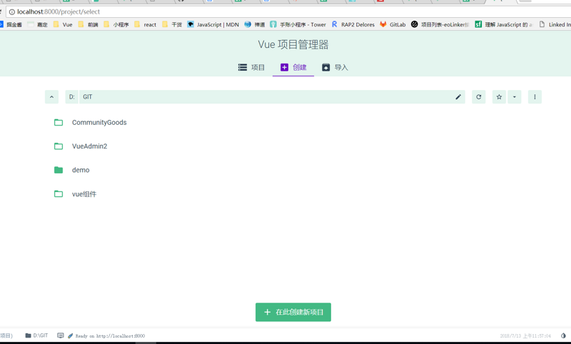 这里需要到自定义目录下,方便以后的项目管理;执行命令后,会打开一个localhost:8080的窗口,是vue项目的图形化管理界面