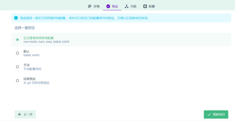 这里配置可以通过预设,也可以使用默认,之后再添加;我这里自己保存了一套自己常用的预设配置,之后就开始安装项目所需依赖。