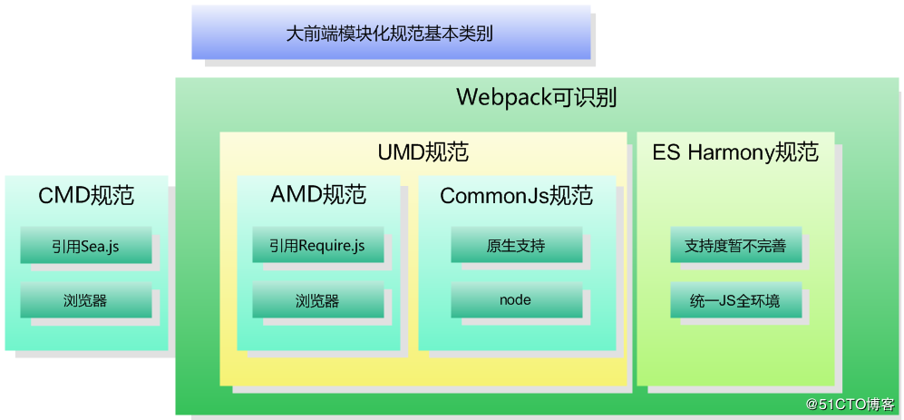 前端模块化本身是一个稍显混乱的话题,笔者自己最初也是require( )和require.js傻傻分不清楚,但模块化是前端开发中非常重要的课题,如果你不想一辈子只是在一个页面内写代码,这一关是一定要过的,感兴趣的读者可以按照下面的基本类别划分分块进行学习。