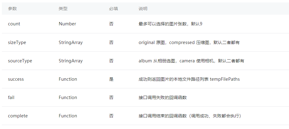 小程序上传图片要先了解他其中的各个属性值,在https://developers.weixin.qq.com/miniprogram/dev/api/media-picture.html内有详细的介绍