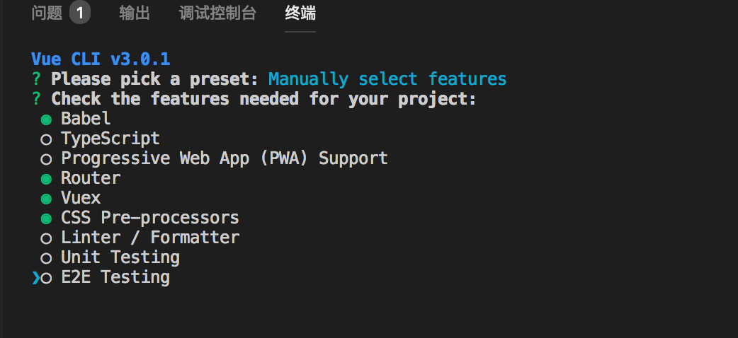你会被提示选取一个 preset。你可以选默认的包含了基本的 Babel + ESLint 设置的 preset,也可以选“手动选择特性”来选取需要的特性。