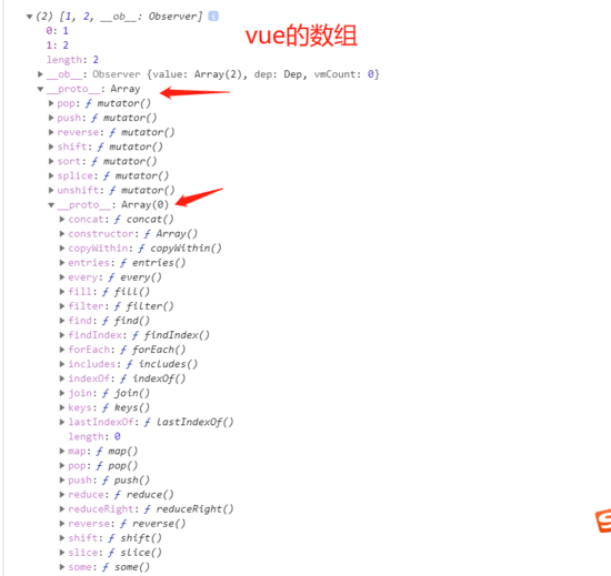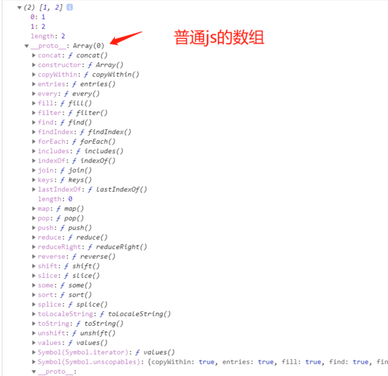 这里实际就是修改数组时调用set方法时让我们能够触发响应的代码,不过在分析这段代码之前我们来看看vue中的数组实际上是长什么样的。 下图分别是vue中的数组和普通的js数组: