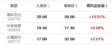 { name:'高科石化', bn:'002778', in_price: 20.68, now_price: 28.68, increase: 10.01 },