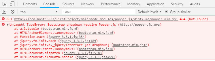 问题描述:使用bootstrap的dropdown部件,打开网页后点击dropdown,报了如下错误:error:Bootstrap dropdown require Popper.js