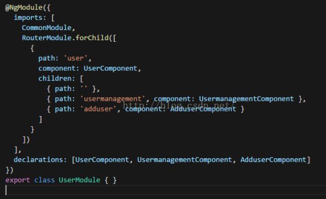 仍然是写在user.module.ts 中,在注入组件之后,写入二级路由forChild,此处必不可少的是path的空白链接!!不然会报user的错,相当于一个父层的定向