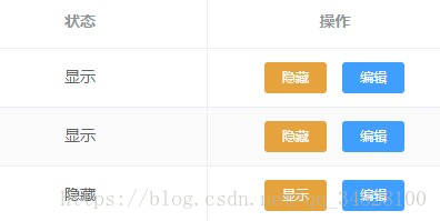 <!-- 数据表格 --> <el-table :data="tableData" class="table" stripe border v-loading="loading"> <el-table-column type="index" label="序号" width="70"></el-table-column> <el-table-column prop="status" label="状态"></el-table-column> <el-table-column label="操作"> <template slot-scope="scope"> <el-button v-if="scope.row.status=='显示'" size="mini" type="warning" @click="handleIsDisplay(scope.$index, scope.row)">隐藏</el-button> <el-button v-if="scope.row.status=='隐藏'" size="mini" type="warning" @click="handleIsDisplay(scope.$index, scope.row)">显示</el-button> <el-button size="mini" type="primary" @click="handleEdit(scope.$index, scope.row)">编辑</el-button> <!-- <el-button size="mini" type="danger" @click="handleRemove(scope.$index, scope.row)">删除</el-button> --> </template> </el-table-column> </el-table>