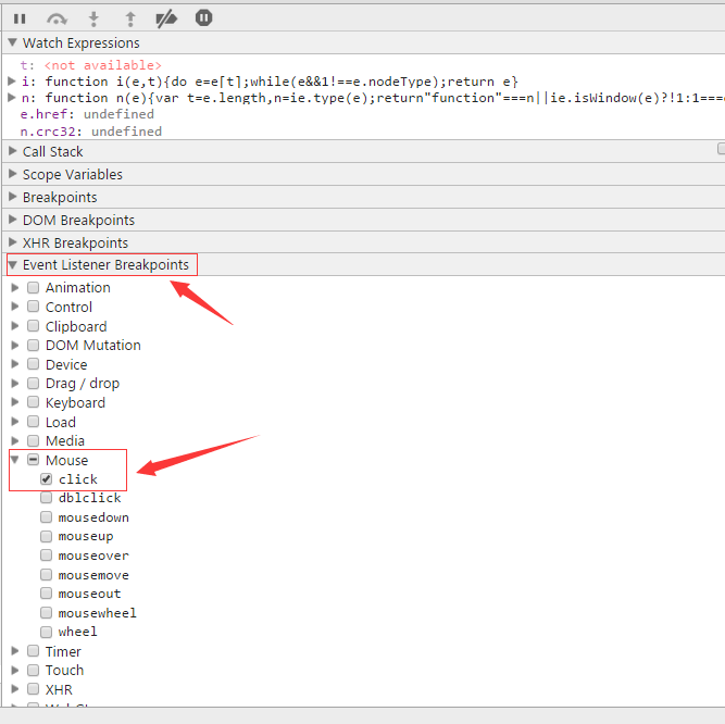 2.看右边的窗口(Event Listener Breakpoints)栏,选择click选项(监听点击事件)。