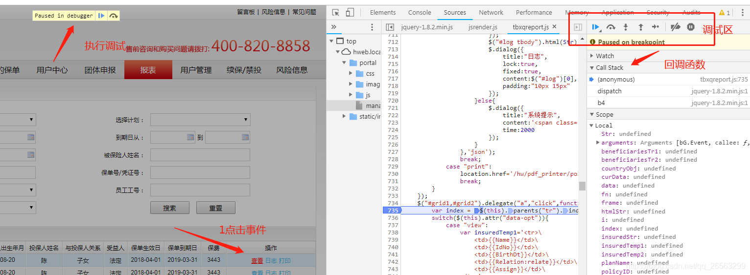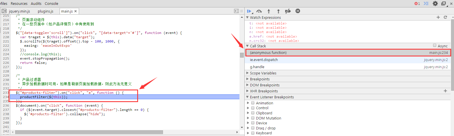 第三步:找到你所需要的监听事件的类型,比如我需要的是点击事件,就打开点击事件,找到对应的js和方法,可能会有多个,可以选择临时移除,找到真正的那一个。
