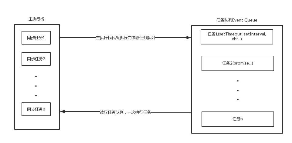 所有的任务可以分为同步任务和异步任务,同步任务,顾名思义,就是立即执行的任务,同步任务一般会直接进入到主线程中执行;而异步任务,就是异步执行的任务,比如ajax网络请求,setTimeout 定时函数等都属于异步任务,异步任务会通过任务队列( Event Queue )的机制来进行协调。具体的可以用下面的图来大致说明一下: