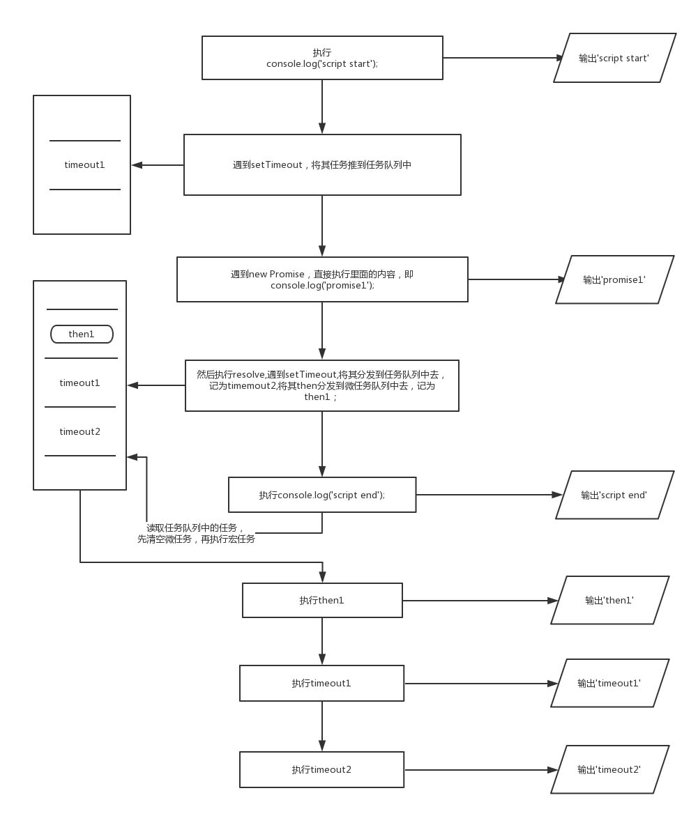 首先,事件循环从宏任务 (macrotask) 队列开始,最初始,宏任务队列中,只有一个 scrip t(整体代码)任务;当遇到任务源 (task source) 时,则会先分发任务到对应的任务队列中去。所以,就和上面例子类似,首先遇到了console.log,输出 script start; 接着往下走,遇到 setTimeout 任务源,将其分发到任务队列中去,记为 timeout1; 接着遇到 promise,new promise 中的代码立即执行,输出 promise1, 然后执行 resolve ,遇到 setTimeout ,将其分发到任务队列中去,记为 timemout2, 将其 then 分发到微任务队列中去,记为 then1; 接着遇到 console.log 代码,直接输出 script end 接着检查微任务队列,发现有个 then1 微任务,执行,输出then1 再检查微任务队列,发现已经清空,则开始检查宏任务队列,执行 timeout1,输出 timeout1; 接着执行 timeout2,输出 timeout2 至此,所有的都队列都已清空,执行完毕。其输出的顺序依次是:script start, promise1, script end, then1, timeout1, timeout2