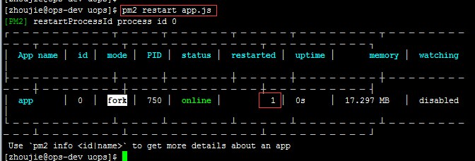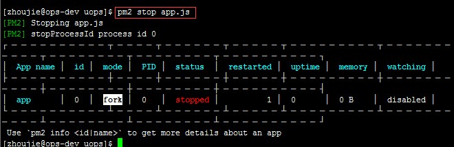 [zhoujie@ops-dev uops]$ pm2 list ┌──────────┬────┬──────┬─────┬────────┬───────────┬────────┬─────────────┬──────────┐ │ App name │ id │ mode │ PID │ status │ restarted │ uptime │ memory │ watching │ ├──────────┼────┼──────┼─────┼────────┼───────────┼────────┼─────────────┼──────────┤ │ app │ 0 │ fork │ 984 │ online │ 1 │ 3s │ 64.141 MB │ disabled │ └──────────┴────┴──────┴─────┴────────┴───────────┴────────┴─────────────┴──────────┘ Use `pm2 info <id|name>` to get more details about an app