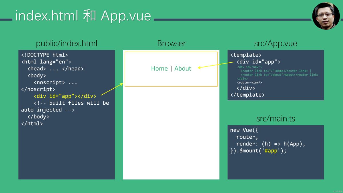 HTML 需要定义一个 <div> 作为 Vue 应用的容器,main.ts 中会通过 new Vue(...) 生成应用实例并将之与容器绑定。注意 HTML 中定义的 <div id="app"></div> 会被 App.vue 模板中定义的 <div id="app">...</div> 替换掉。