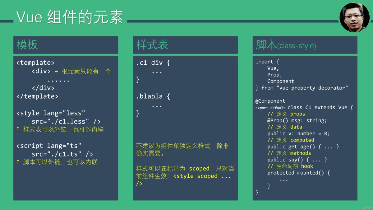 既然我们选用 TypeScript,使用上图所示的 class-style 来实现 Vue 组件更为适合。
