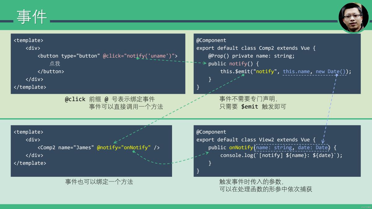 在 HTML 或自定义组件标签中使用 @ 前缀的事件名,可以绑定事件处理函数。Vue 实现了部分 HTML 事件,比如 @click 可以直接绑定。组件也可以“定义”自己的事件,不需要提前声明,只需要 this.$emit() 直接触发即可。