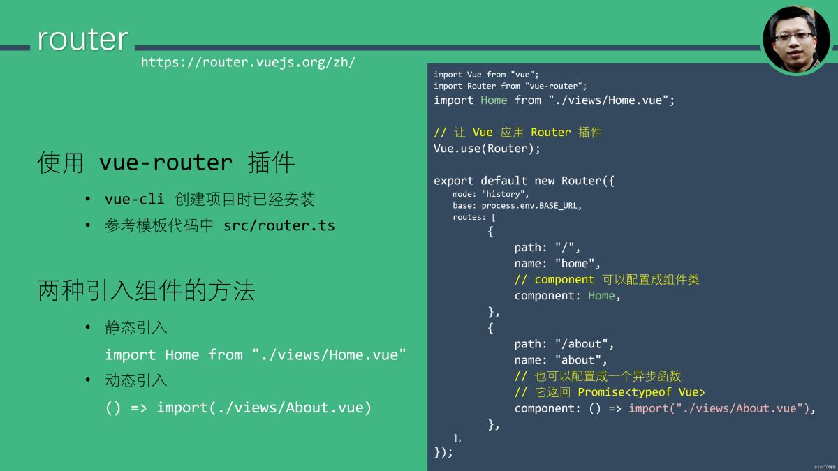 路由项配置中的 component 可以指定为导入的的组件类,也可以指定一个异步(返回 Promise 的)函数,该函数动态加载组件并返回包含该组件类的 Promise 对象。上例中使用的 import() 动态引入语法。