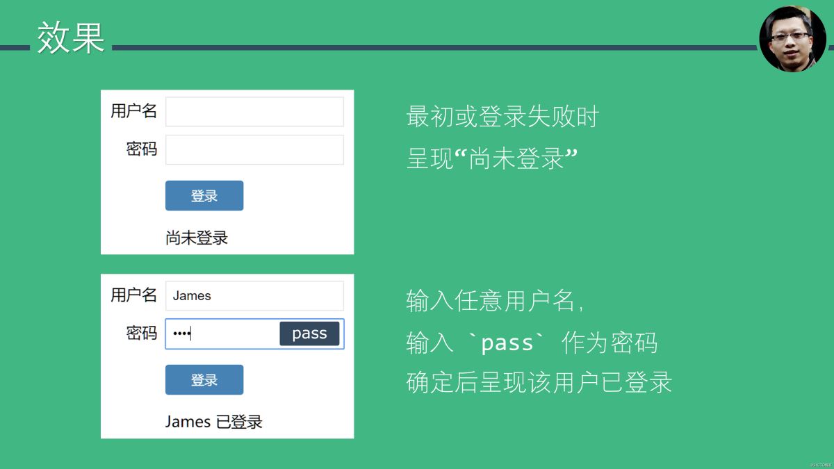 做一个简单的登录界面加深对前面知识的理解和记忆。该示例特意避免了 Ajax 调用,以降低其复杂程度。