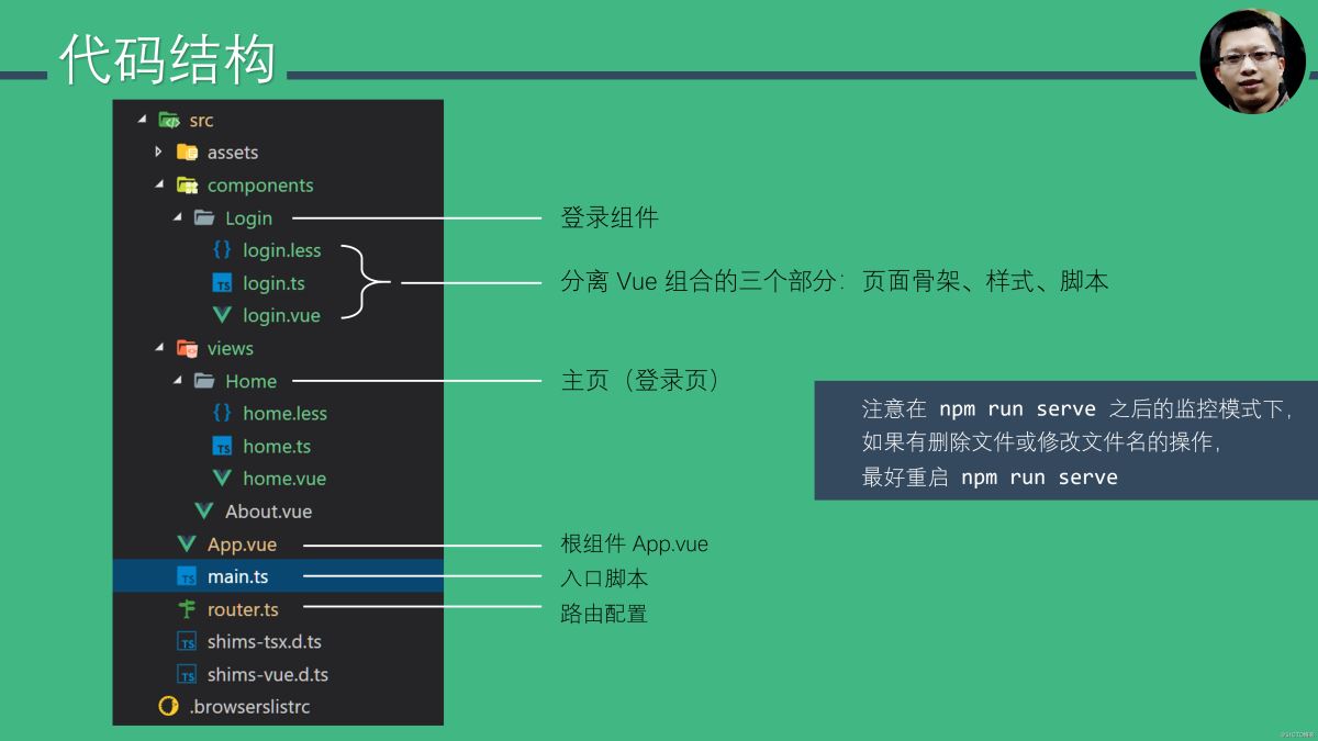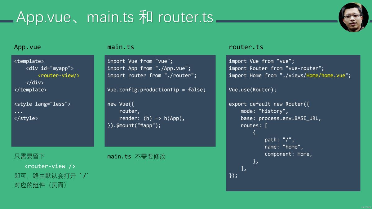 App.vue、main.ts 和 router.ts 可以算得上是一个 Vue 应用的入口和基本配置。App.vue 中直接把控制权交给了 vue-router。注意,import 的时候不能省略 .vue 扩展名。