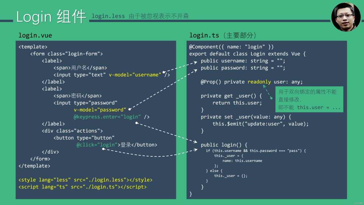 Login 组件中用到了双向绑定,由于属性(由 @Prop() 修饰)不可以在内部修改,甚至可以把它声明为 readonly(也许 Vue 3 会定义相关的规范)。注意到 keypress 事件有一个后缀,这在 Vue 中称为事件修饰符,可以用于快速处理一些特殊情况,比如 keypress.enter 表示Enter按下时。