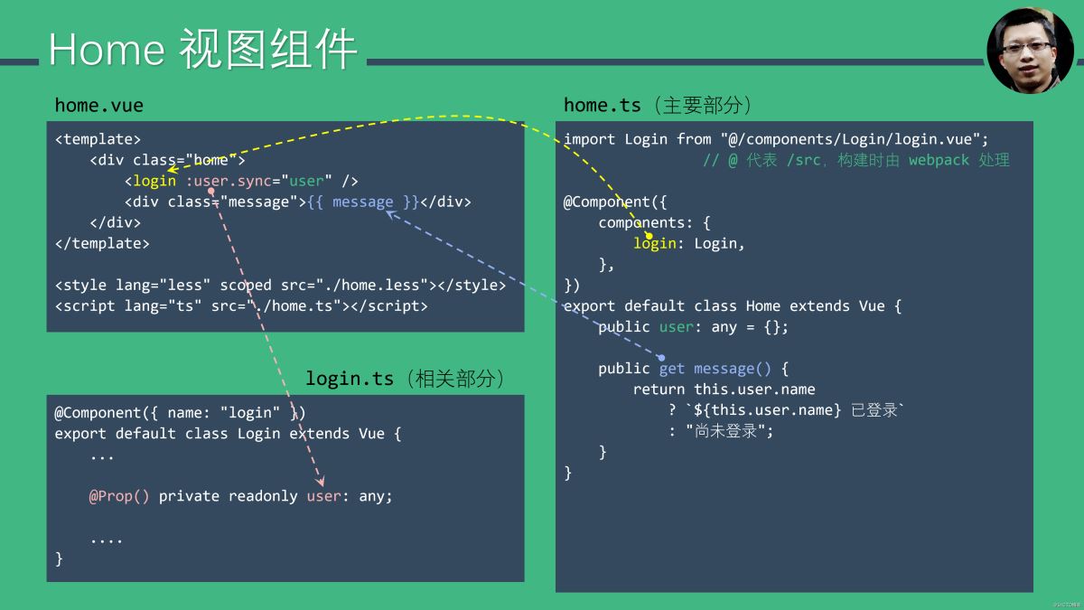 在 Home 中使用 Login 组件时,Home 的 user 数据字段绑定到了 Login 的 user 属性上,.sync 修饰符表示这是一个双向绑定。前面 Login 的代码中,如果登录成功,Login 会通过 $emit("update:user", {...}) 来通知绑定数据发生变化,Vue 框架接收到这个通知并更新了绑定的 Home.user,这会导致计算属性 message 重算,并最终触发呈现“某用户已登录”。