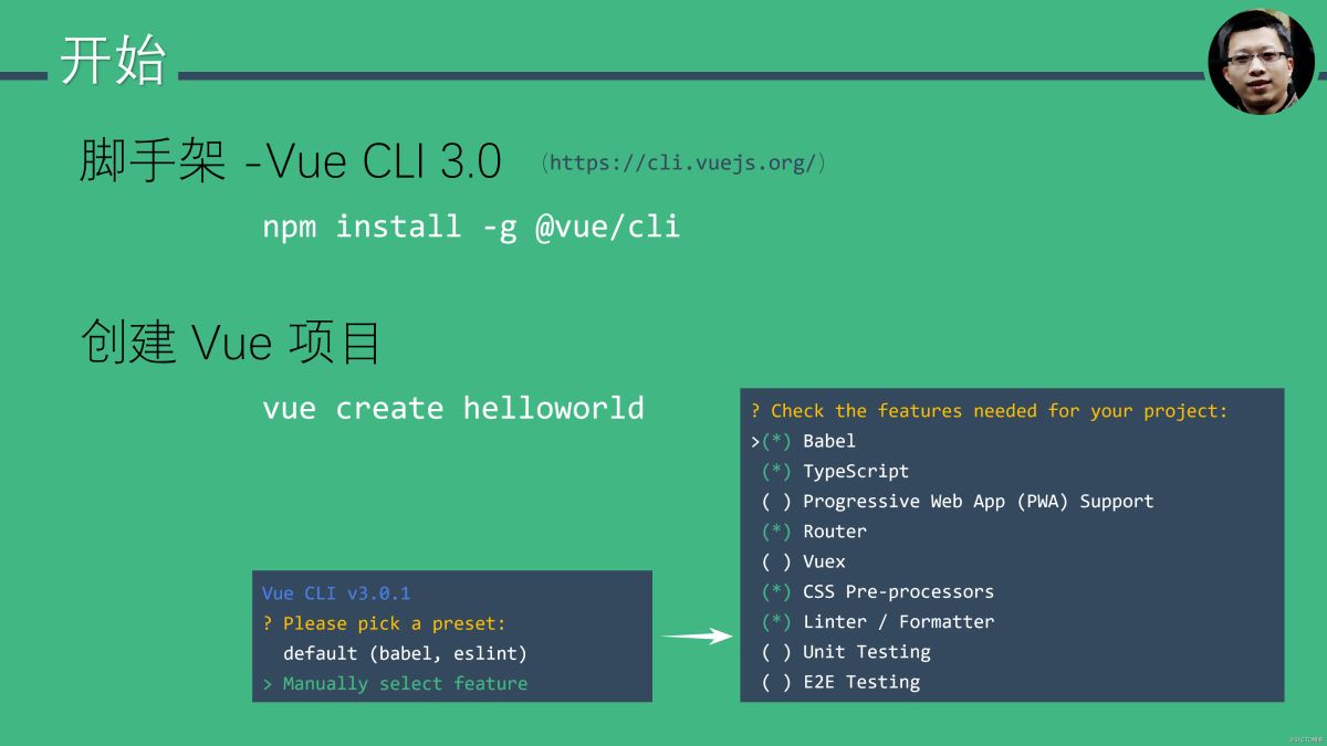 Vue 很早就支持 TypeScript,但配置起来比较麻烦,幸好有了 Vue CLI 3.0。安装好 vue-cli 之后,使用 vue create 项目名称 来创建项目,vue 脚本手架自动创建以项目名称命名的目录。