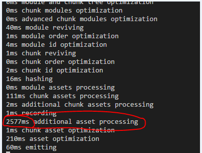 图中红色部分就是耗时最长的地方了,好了,发现了耗时时间长的地方了,经过百度搜索,发现也有个问题和我这个非常类似,他的原因是因为使用了uglifyJsPlugin插件,这么一想,我的项目中的webpack配置中也用到了这个插件,于是把这个插件移到生产环境中使用,修改之后重启项目,修改某个文件之后,查看控制台,如下