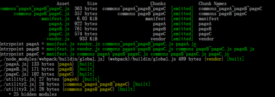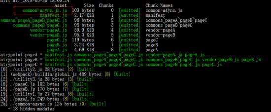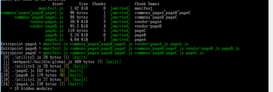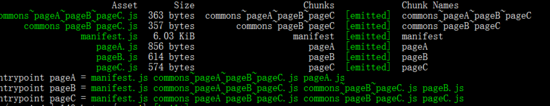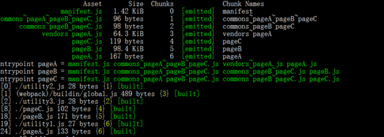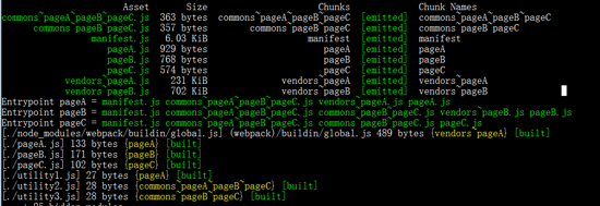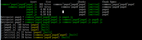 结果如图,一切都很正常 commons~pageA~pageB~pageC.js 文件就是utility2.js commons~pageB~pageC.js,根据上述代码,这里的utility2被引用了三次,首先就被抽离了commons~pageA~pageB~pageC.js,然后utility3被引用了两次就放到了commons~pageB~pageC.js,最后只剩下被引用一次的utility1.js,就直接放到了pageA.js里面,如果这里的utility1.js的也是两次,他还是会新建一个chunk放进去,而不是合并到commons~pageB~pageC.js,除非同入口引用才会合并。