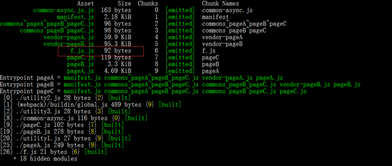 这时候再试试,在这个common-async.js里面在引入共同的代码f.js,看看会不会重复打包