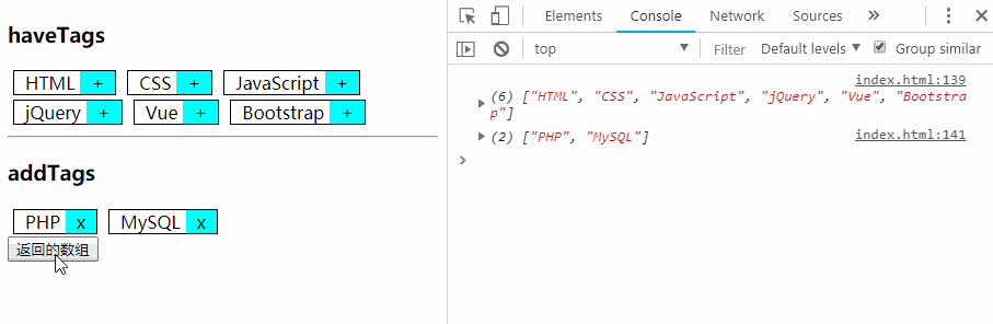 <h3>haveTags</h3> <div id="havetags"></div> <hr /> <h3>addTags</h3> <div id="addtags"></div> <button id="btn">返回的数组</button>