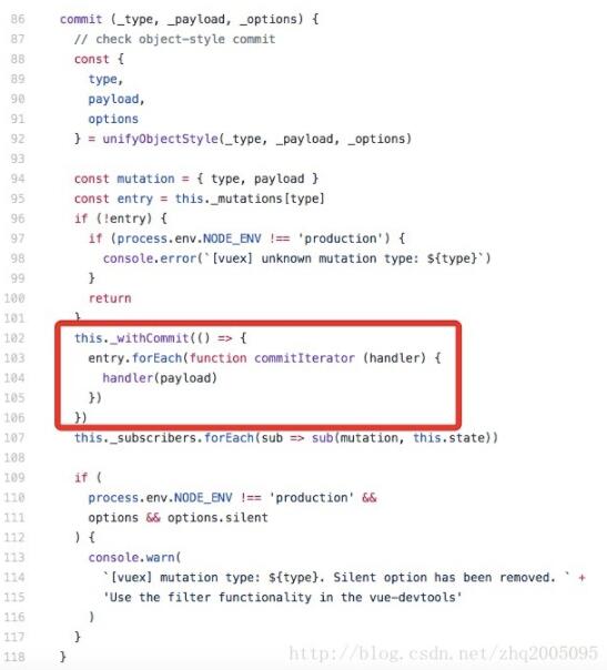 在commit函数内部,由this._commit()函数来修改state。那么 _withCommit 又是什么呢,接着看 _withCommit 的代码: