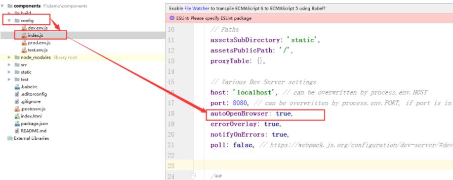 但是并不会自动打开浏览器展示页面,此时仅需要打开config文件下的index.js文件,更改autoOpenBrowser为true即可实现。