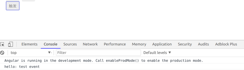 3.我们的事件输出了一个字符串test event,然后通过$event获取这个输出结果,并当做参数传给上一级的方法showEvent