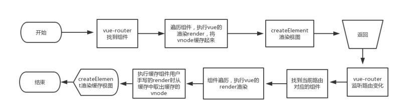 这里会有 vnode.elm 缓存了 vnode 创建生成的 DOM 节点。所以对于首次渲染而言,除了在 <keep-alive> 中建立缓存,和普通组件渲染没什么区别。从进入到返回的大致执行流程如下