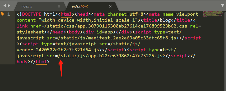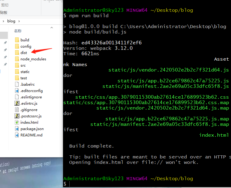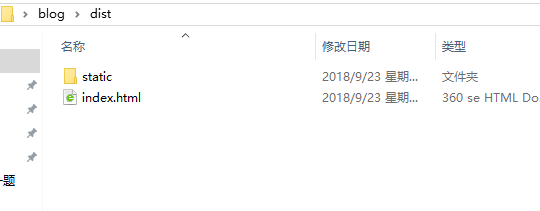 打包后会生成 一个 dist 文件夹,里边有 index.html文件 和 static文件夹
