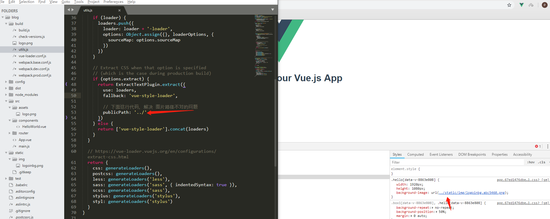 打开 我们的 build 文件夹,找到里边的 utils.js 文件,找到第 51 行(目测是的),添加 这个 代码 publicPath: '../../' ,然后重新打包 就可以了,这时资源路径就对了。