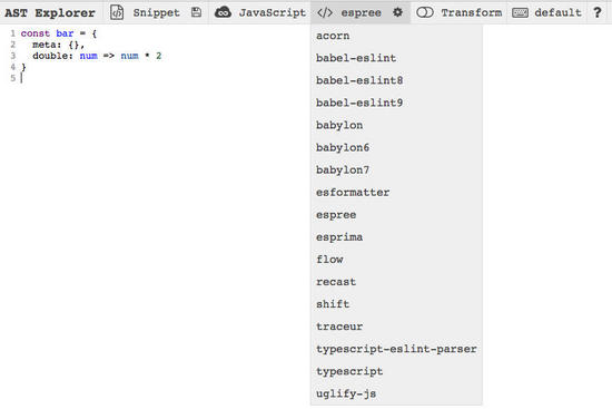 点进去别着急复制代码查看 AST 结果,首先选择 espree(eslint 使用的语法解析库),如下