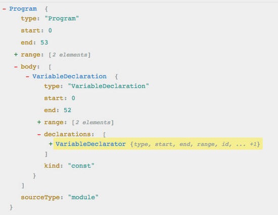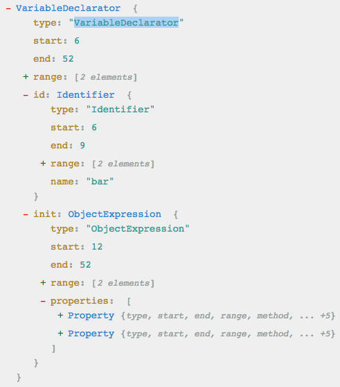 由于全展开太长了哈,感兴趣的自行尝试,会发现层级嵌套的特别深,找到 bar 的属性需要 Program.body[0].declarations[0].init.properties