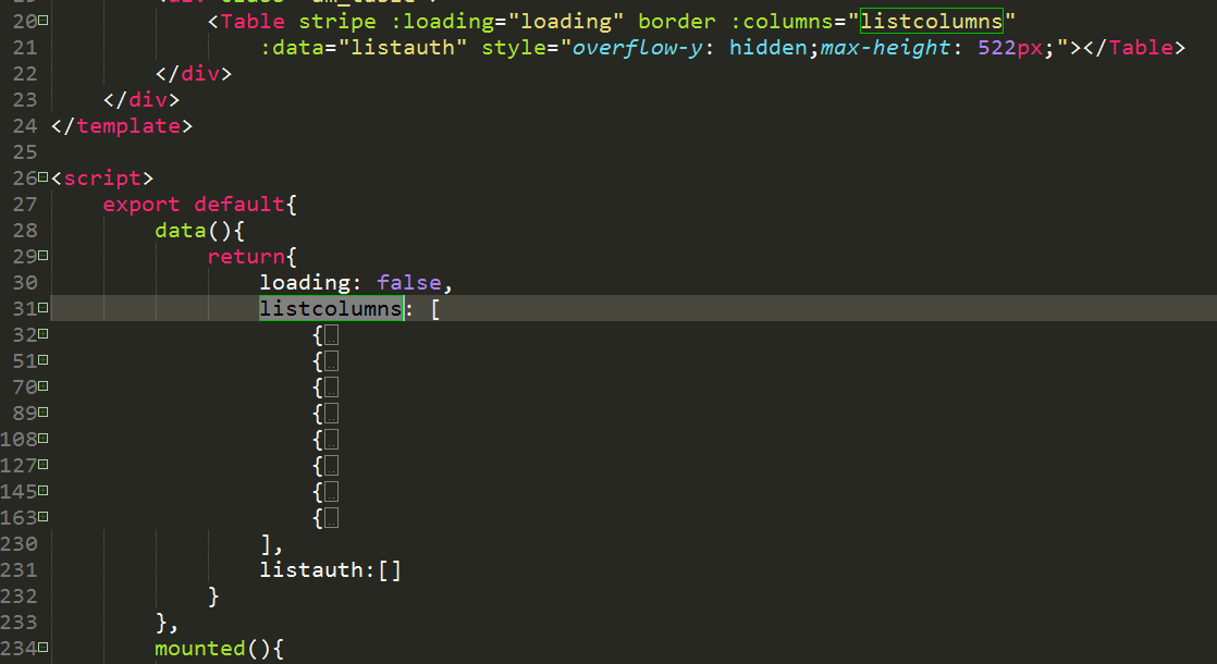 <Table stripe: loading = "loading": showHeader = false border: columns = "listcolumns": data = "listauth"style = "overflow-y: hidden;max-height: 522px;" > </Table>