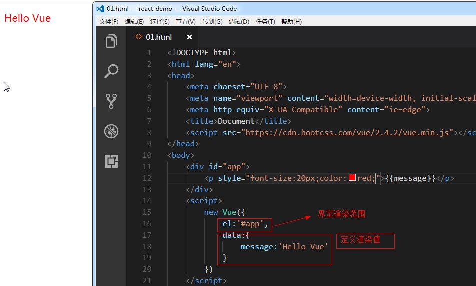 我们知道jq是简化了dom操作,而react和vue则是通过使用虚拟dom的方式,不需要频繁的更改ui界面,而是通过更改数据的方式来更新界面。我们知道些jq插件时会在IFFE中传入jQuery,jQuery在此程序中映射为符号,这样可以避免$号被其他库覆写。其实vue中new Vue()对象,效果也是类似,可以避免vue范围类的数据或变量被污染。我们先来看一些基本的用法插入文本值