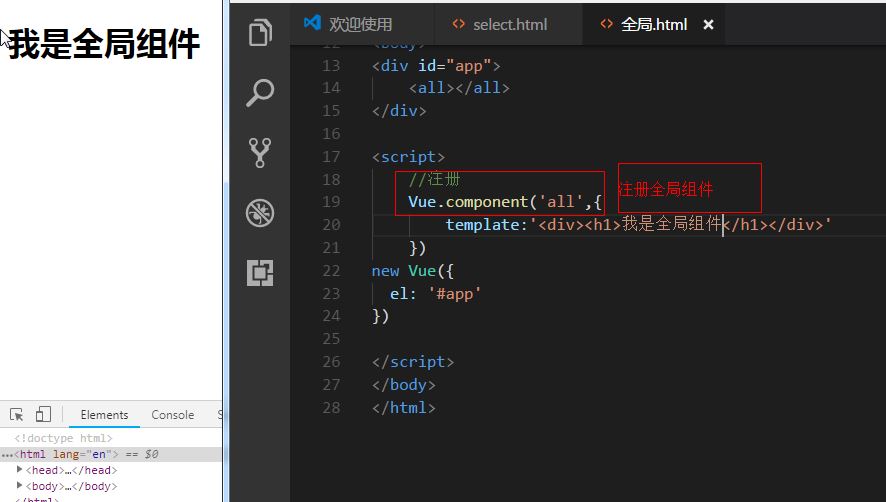 组件组件(Component)是 Vue.js 最强大的功能之一。组件可以扩展 HTML 元素,封装可重用的代码。全局组件所有实例都能用全局组件