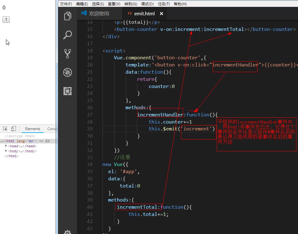 自定义事件父组件是使用 props 传递数据给子组件,但如果子组件要把数据传递回去,就需要使用自定义事件