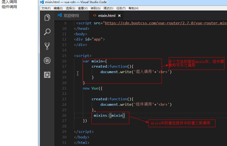 mixin mixins就是定义一部分公共的方法或者计算属性,然后混入到各个组件中使用,方便管理与统一修改。如果组件中定义的方法与混入对象中的方法/属性一样,组件中的优先级大于混入对象中的(方法会调用多次)