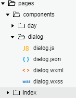 首先我们在pages文件夹下创建components目录用于存放自定义组件。如图所示,以我创建的dialog组件为例,自定义组件的格式与页面一样,分为4个文件。