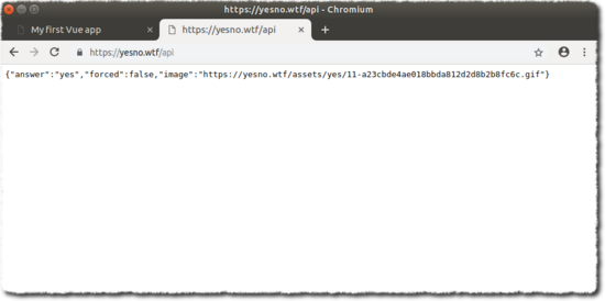 这里访问的后端是 https://yesno.wtf/api ,它传回的数据时 json 格式的,如果直接访问它,得到的结果如下: